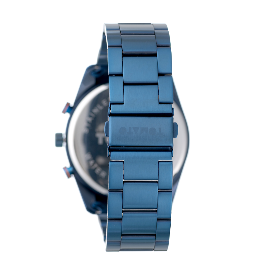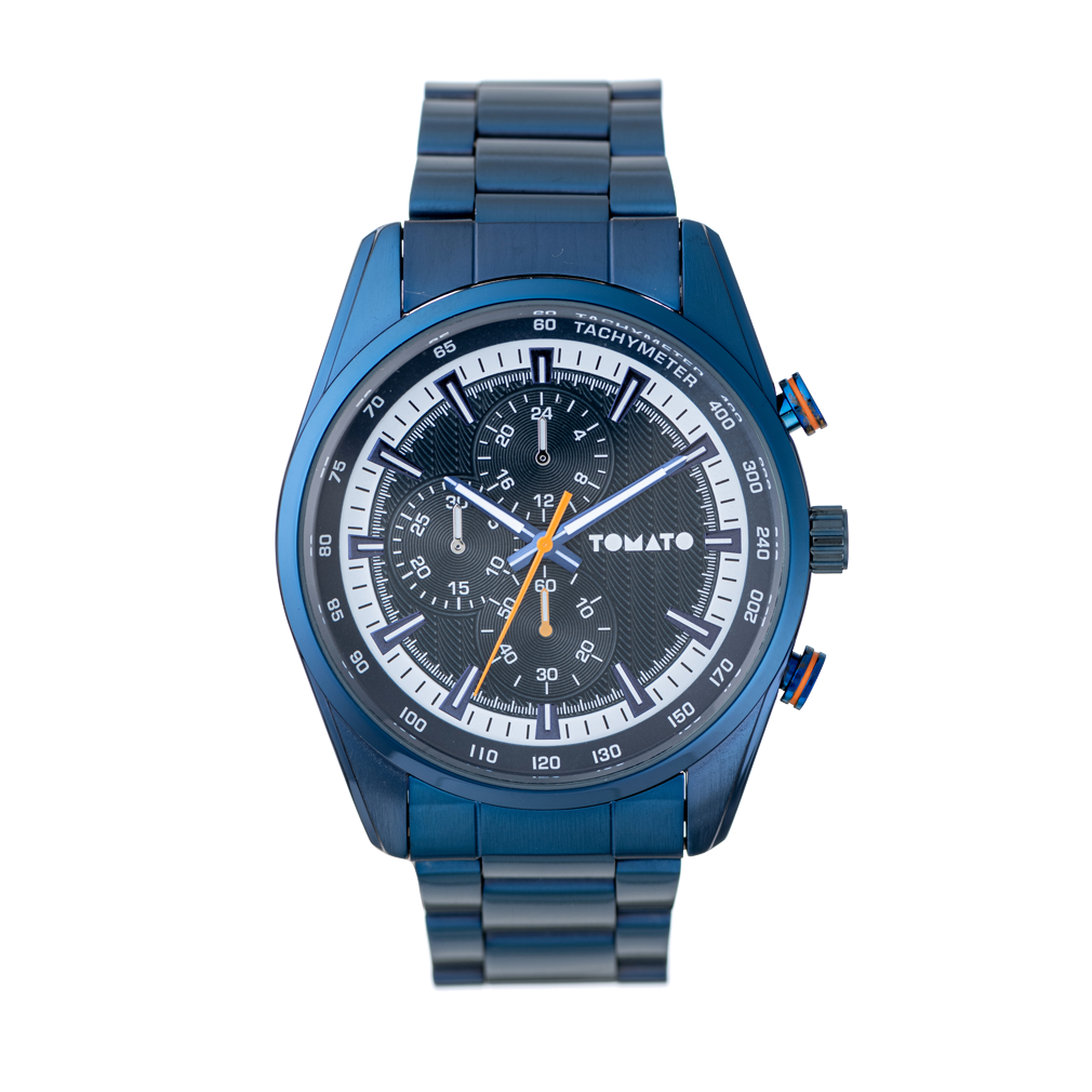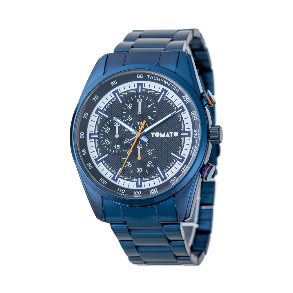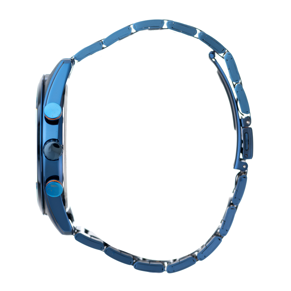 The Aoki watch combines bold design with reliable chronograph performance. Featuring a striking blue bracelet strap and case, it stands out while offering durability for everyday wear. The detailed black dial includes three sub-dials for precise time measurement, making it both stylish and functional.