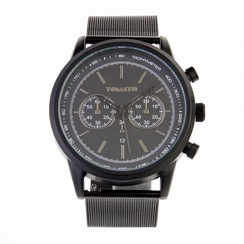 The Atlas watch offers sleek sophistication with its black dial, gold-tone accents, and chronograph sub-dials. A black mesh strap completes the modern look, making it a stylish and functional choice.