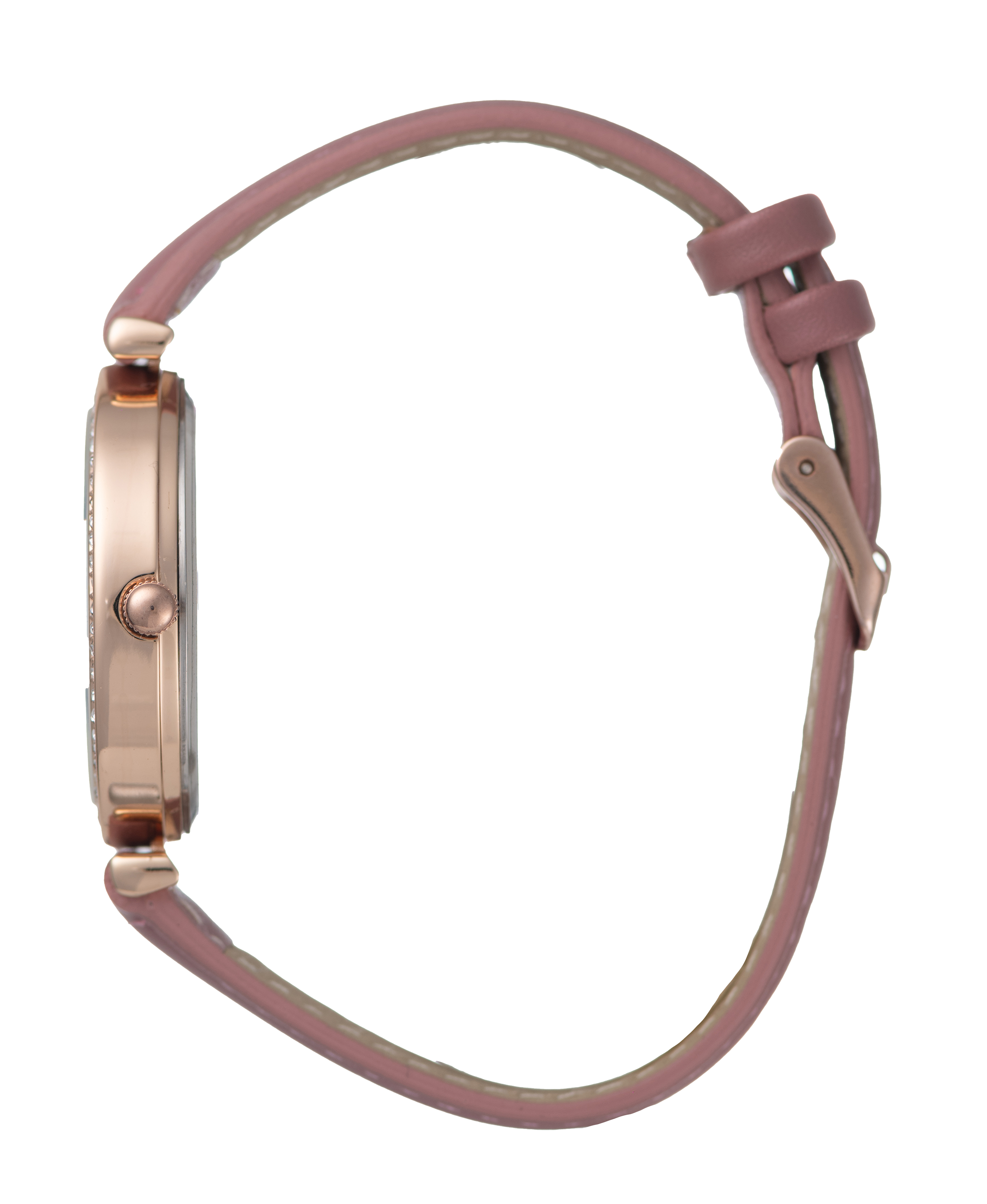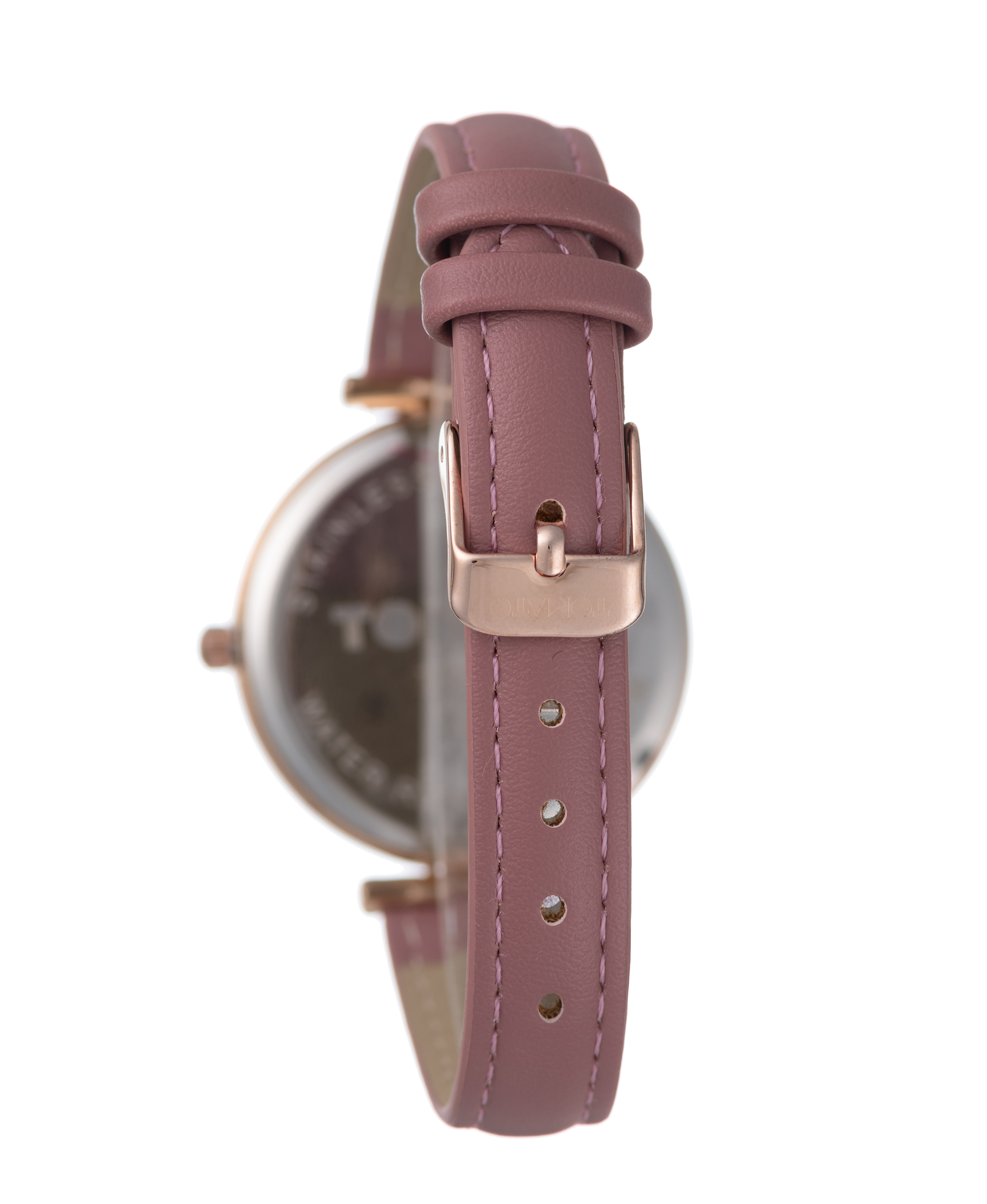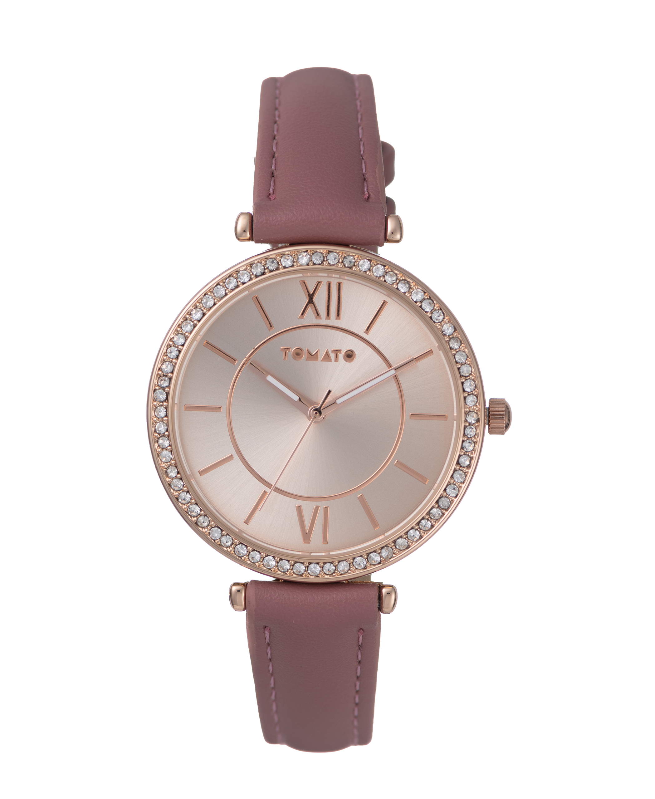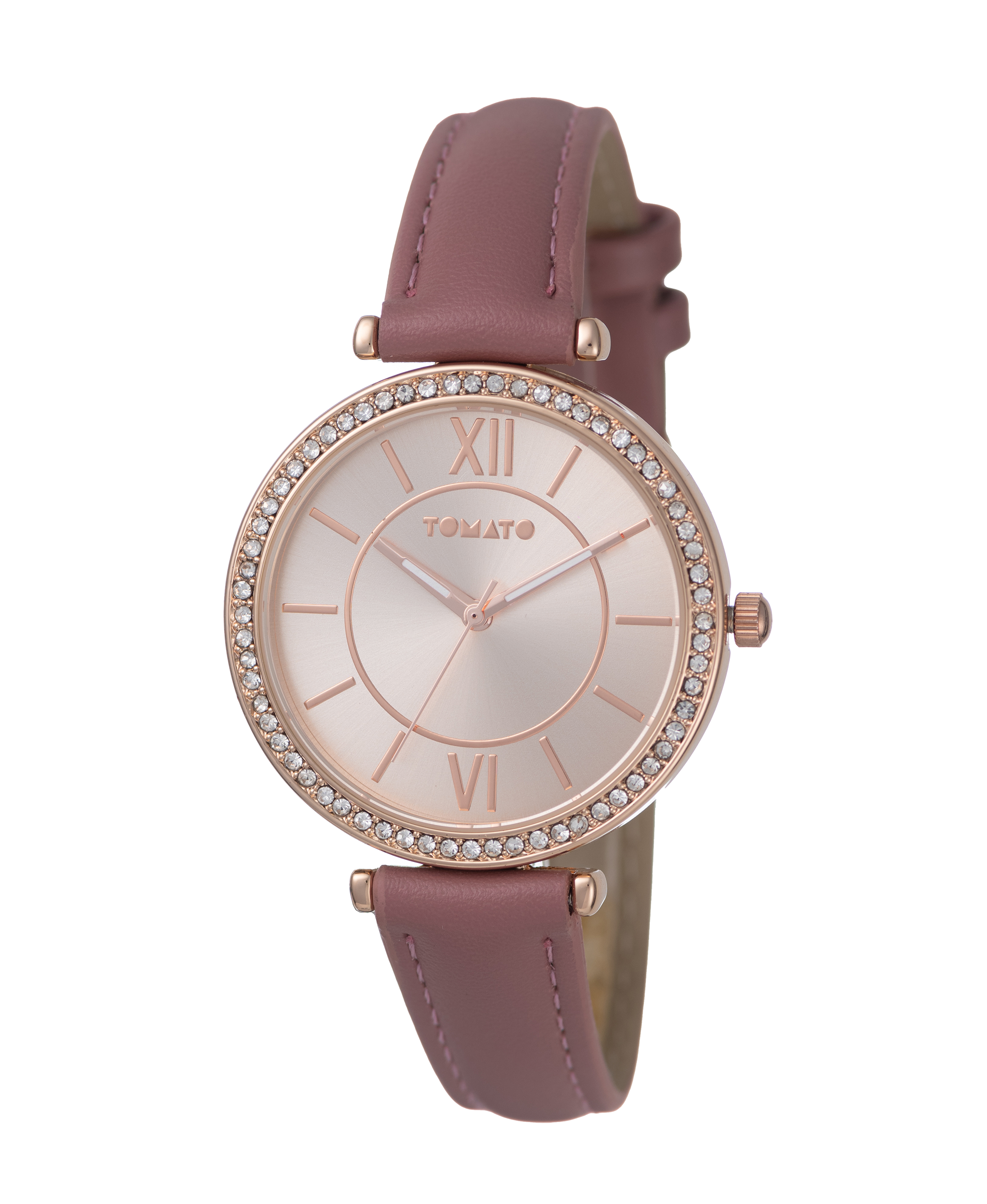 A timeless classic with a modern twist, this Tomato women’s watch features a polished rose gold-tone case adorned with a sparkling crystal bezel for a touch of elegance. The champagne dial is beautifully detailed with Roman numeral markers and minimalist hour lines, creating a refined look that pairs effortlessly with any outfit. The soft mauve strap offers comfort and durability, secured with a sturdy buckle closure. Perfect for everyday wear or special occasions, this watch is a versatile statement piece for your collection.