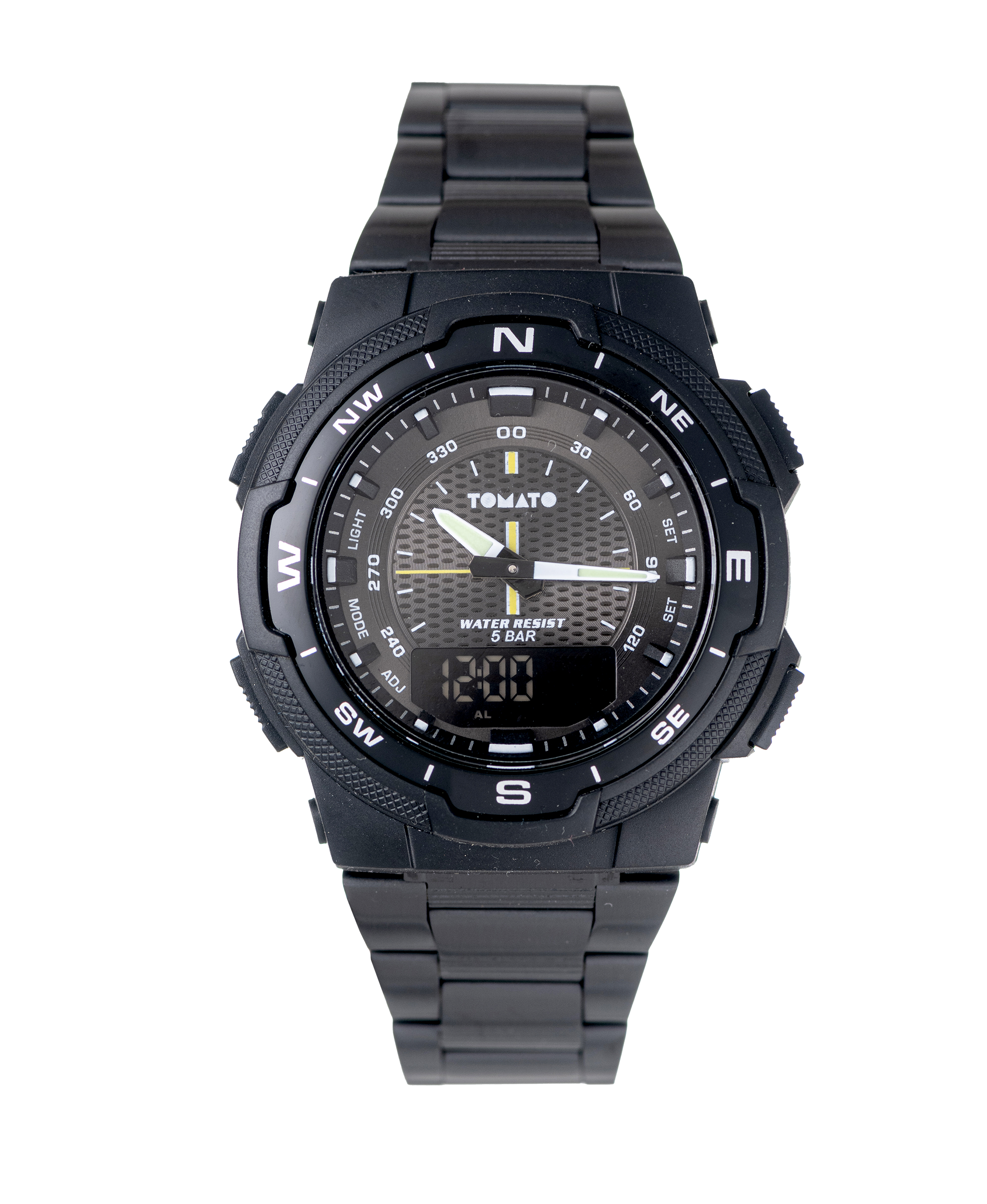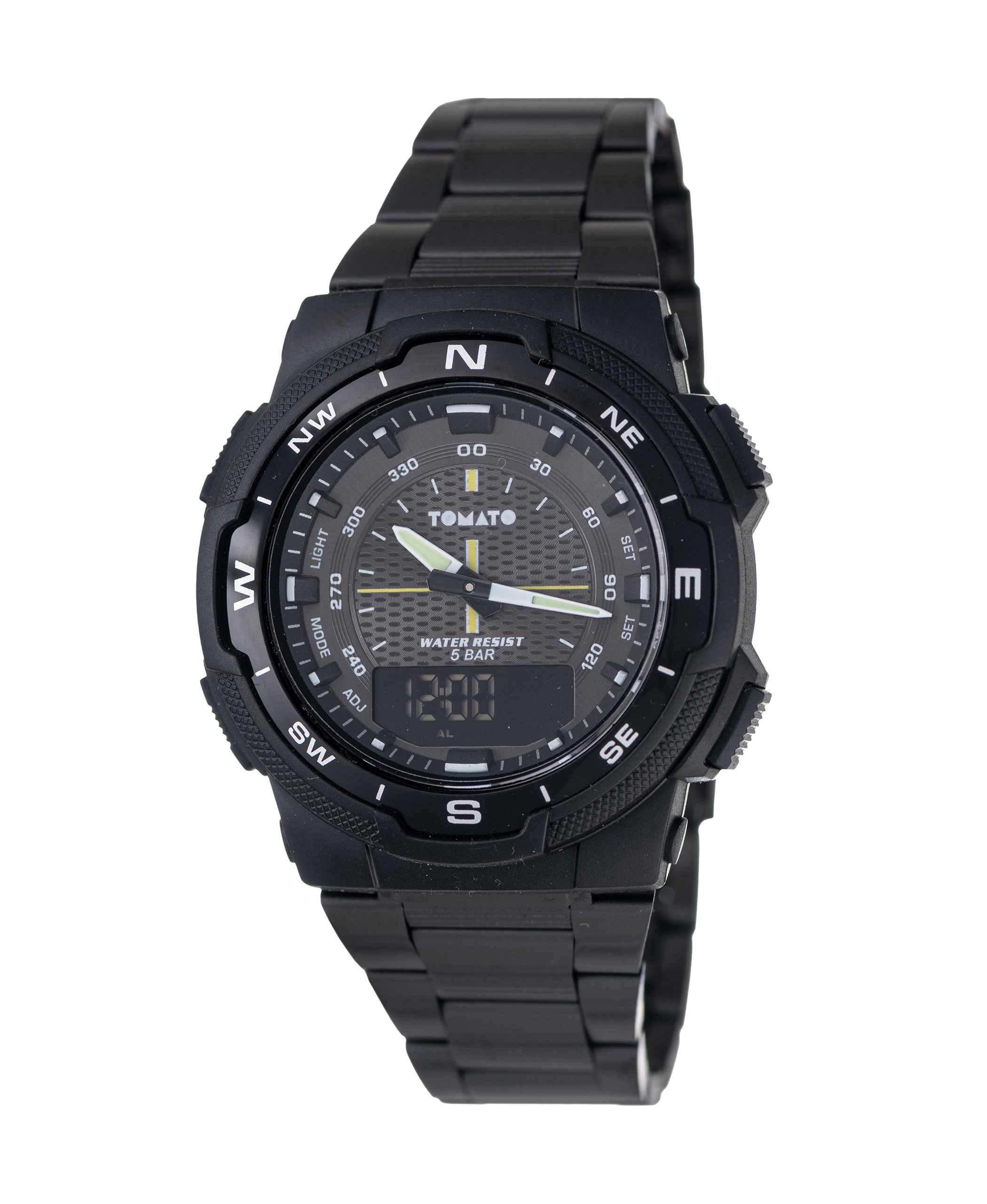 Designed for performance and versatility, the Drake watch combines analog precision with digital functionality. Featuring a bold black case, compass bezel, and bracelet design.