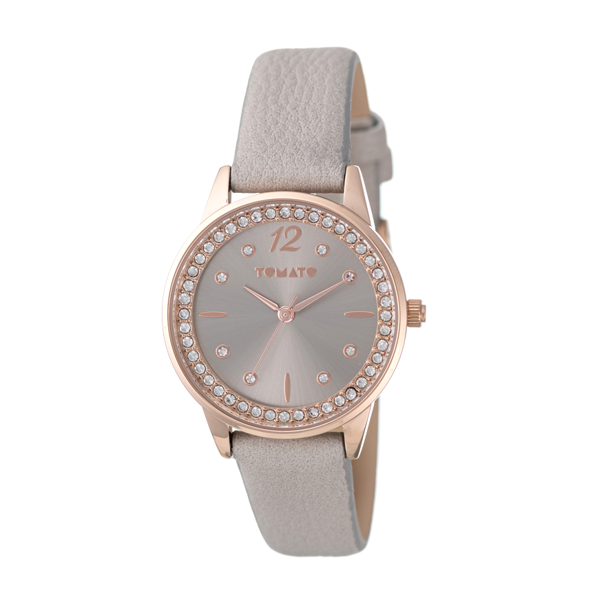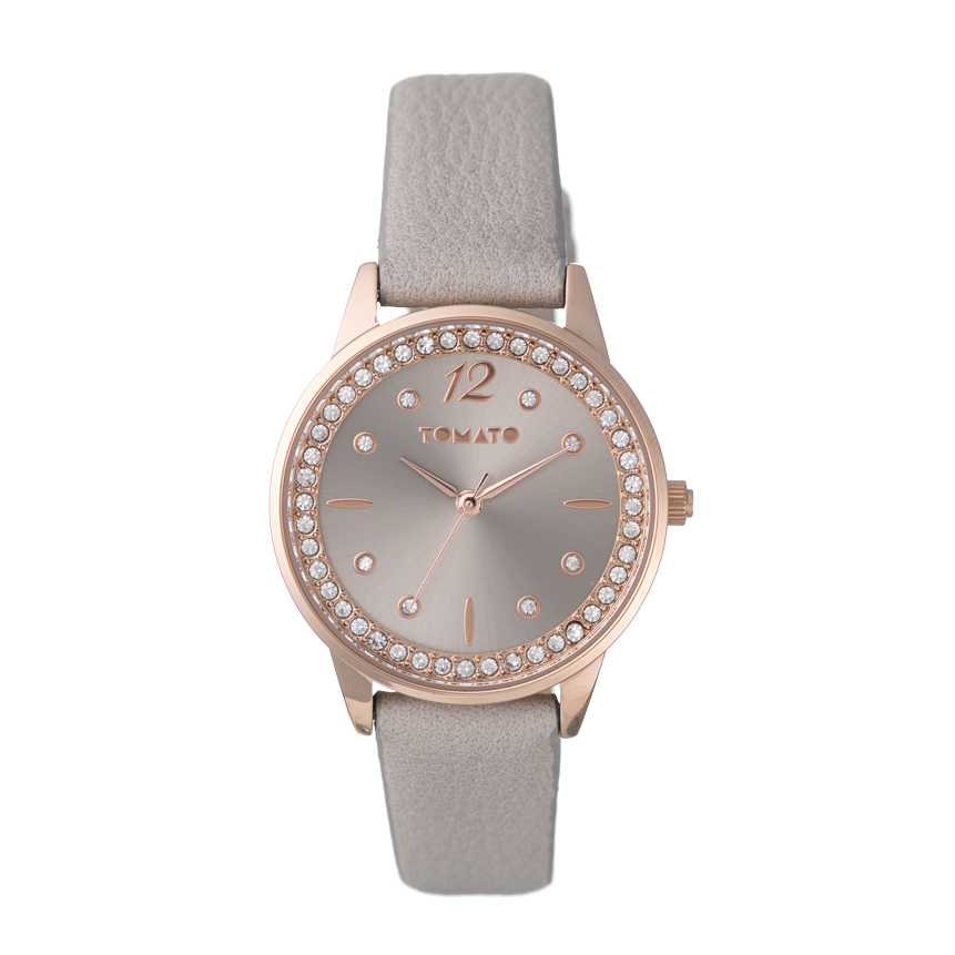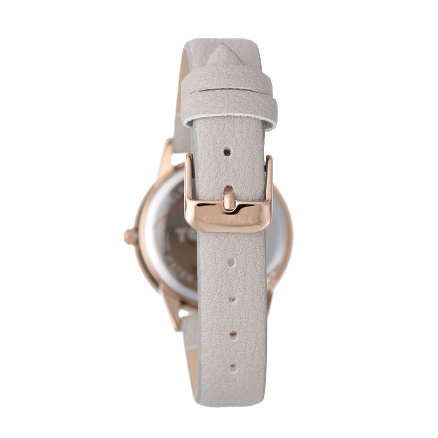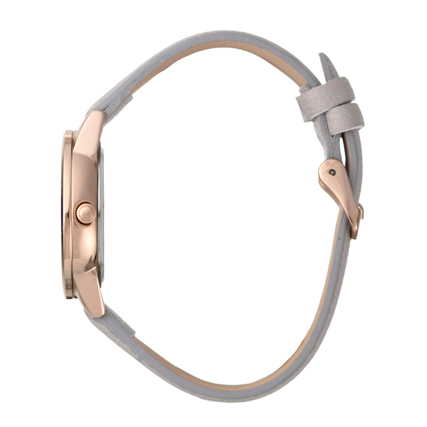 The Fawn watch offers understated charm with its rose gold-tone case, crystal-set bezel, and soft grey leather-look strap. The minimalist dial design and warm metallic accents make it a versatile choice for both work and leisure.