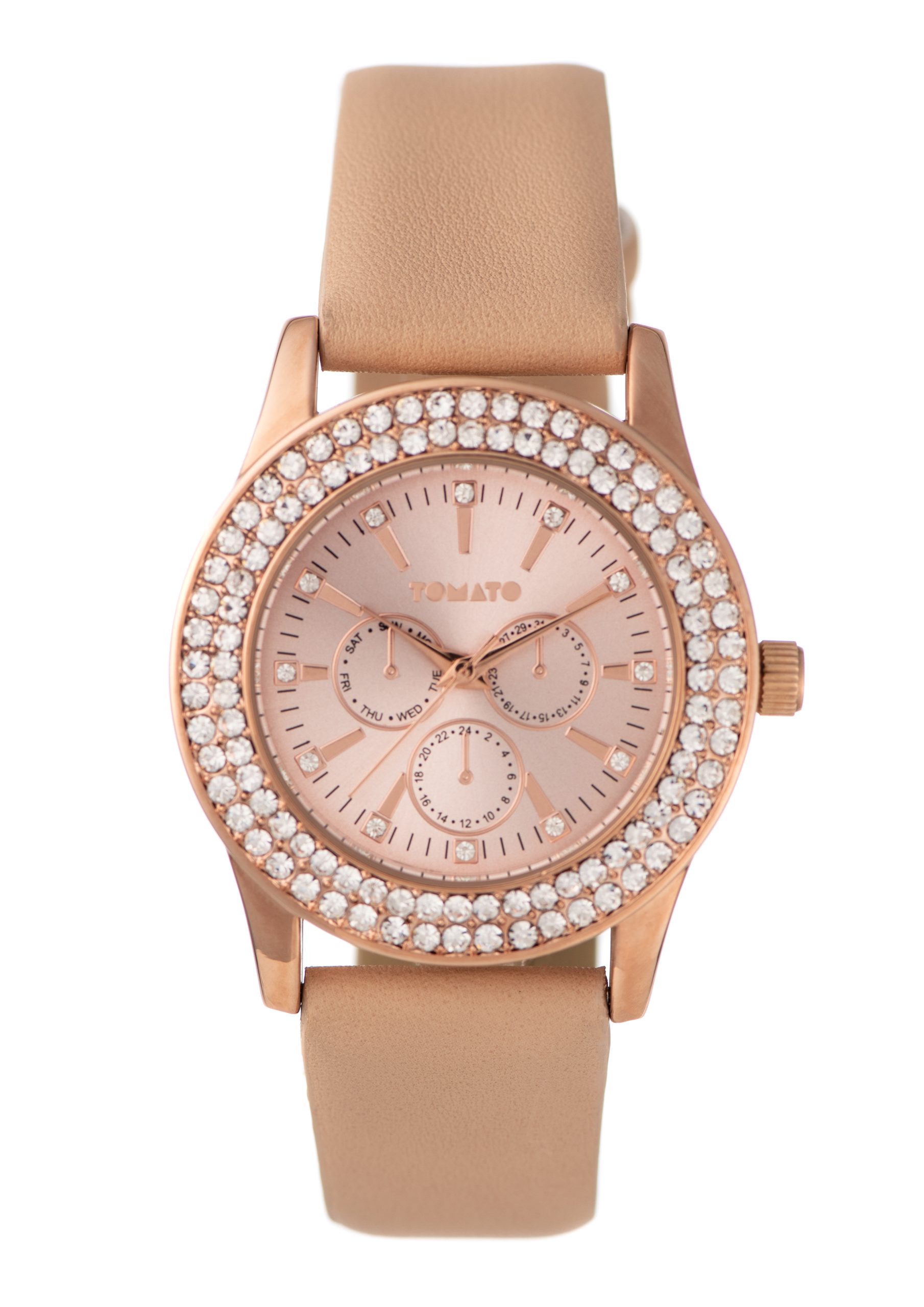 Designed for those who love a touch of glamour, the Serena boasts a sparkling crystal-encrusted bezel surrounding a rose-gold dial. Its taupe leather-look strap ensures a comfortable fit, making it as wearable as it is stylish.